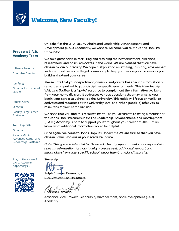 On behalf of the JHU Faculty Affairs and Leadership, Advancement, and Development (L.A.D.) Academy we want to welcome you to the Johns Hopkins University! We are thrilled that you have chosen Johns Hopkins as your academic home!