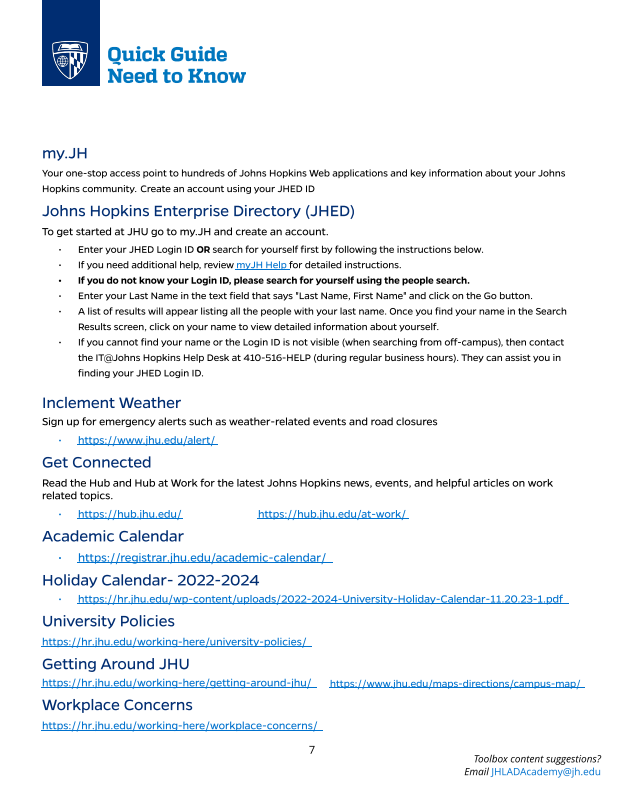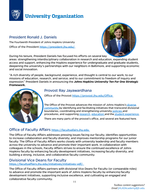 The Provost’s Leadership-Advancement-Development (L.A.D.) Academy wishes to acknowledge the following members of the Johns Hopkins Community whose efforts made this New Faculty Welcome Toolbox possible.
